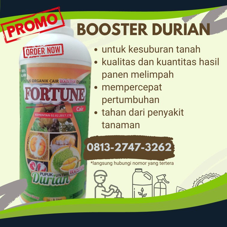 Pupuk FORTUNE BOOSTER adalah pupuk organic nautrisi komplek yang diformulasikan khusus untuk tanaman durian. Dengan formulasi yang terukur ditambah dengan pengayaan nutrisi tinggi menjadikan BOOSTER pupuk organic cair yang cocok untuk budidaya tanaman perkebunan.