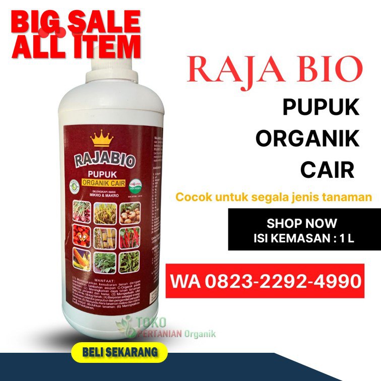 RAJABIO adalah pupuk organik cair diformulasikan dari bahah-bahan alami pilihan, diproses de ngan teknologi fermentasi modern, sehingga pro duk RAJABIO menjadi produk pupuk organik cair yang berkualitas mengandung C-Organik yang me nyuburkan tanah dan mengandung unsur hara ma kro-mikro yang mudah diserap tanaman